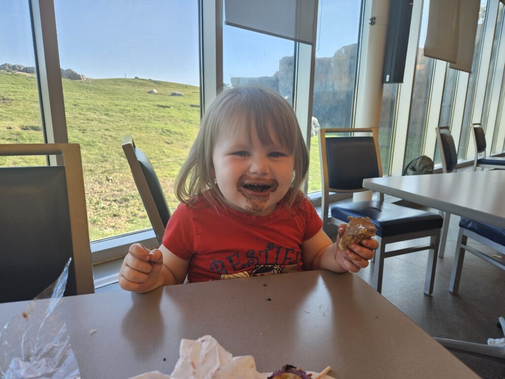 Baby Zay finishes her ice cream cone while the Polar bears sit outside. Zay was super excited to get to share her ice cream with Daddy and Papa. Everyone was having a lot of fun at the Zoo. Zay net a nice boy who she played with in the DiNO SAND BOX