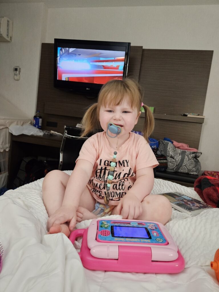 Azaylia sitting in he hotel while we celebrate her 3RD birthday. Zay had been having a great day and got to have her Soo-Soo for the evening. Nani had helped Zay get her hair in cute pig tales. Zay Zay went out and rode Daddy’s longboard and rode the hotel elevator.