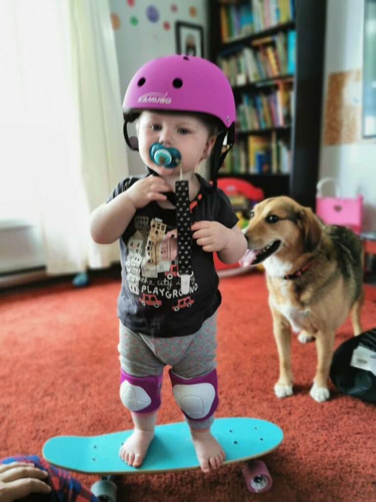 Zay was picking up how to skateboard even at age 2. I got to teach her the basics right from the beginning. She is actually really good at going back and forth in the living room.